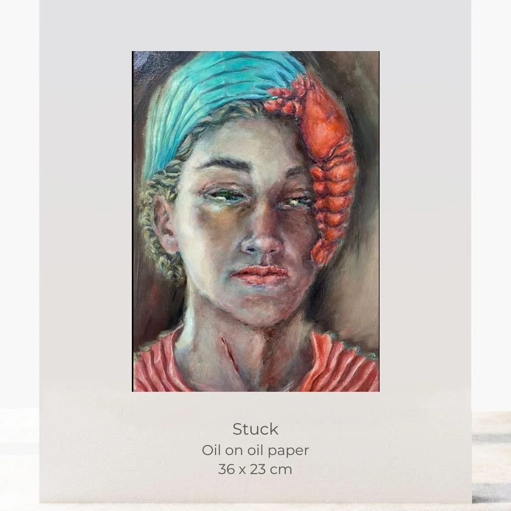 “ In my work, my researches question the metamorphoses, marks, mutilations etc. of the contemporary human body conditioned by the events it goes through and how it can absorb, reject or transcend the impact of those conditionings. Whether because of dramatic events ( war, accident,, exil, toxic relationship...) or because of the quest for identity, belonging, pleasure, power (gender, blood ties, uniform, costume, tatoo, accessories...) Through the process of creation, it suddenly became obvious that my journey was deeply rooted to the process of the Lobster. I decided to research about lobsters The Lobster represents that ability of recreation. It has an incredible potential to recover and grow despite being damaged. Each step that is taken in our stories of life creates a new inner space and a new shell that will need to be removed in order to evolve. The Lobster is the quiet observer, highlighting our inner potential in challenging times. So what will I choose for being?”