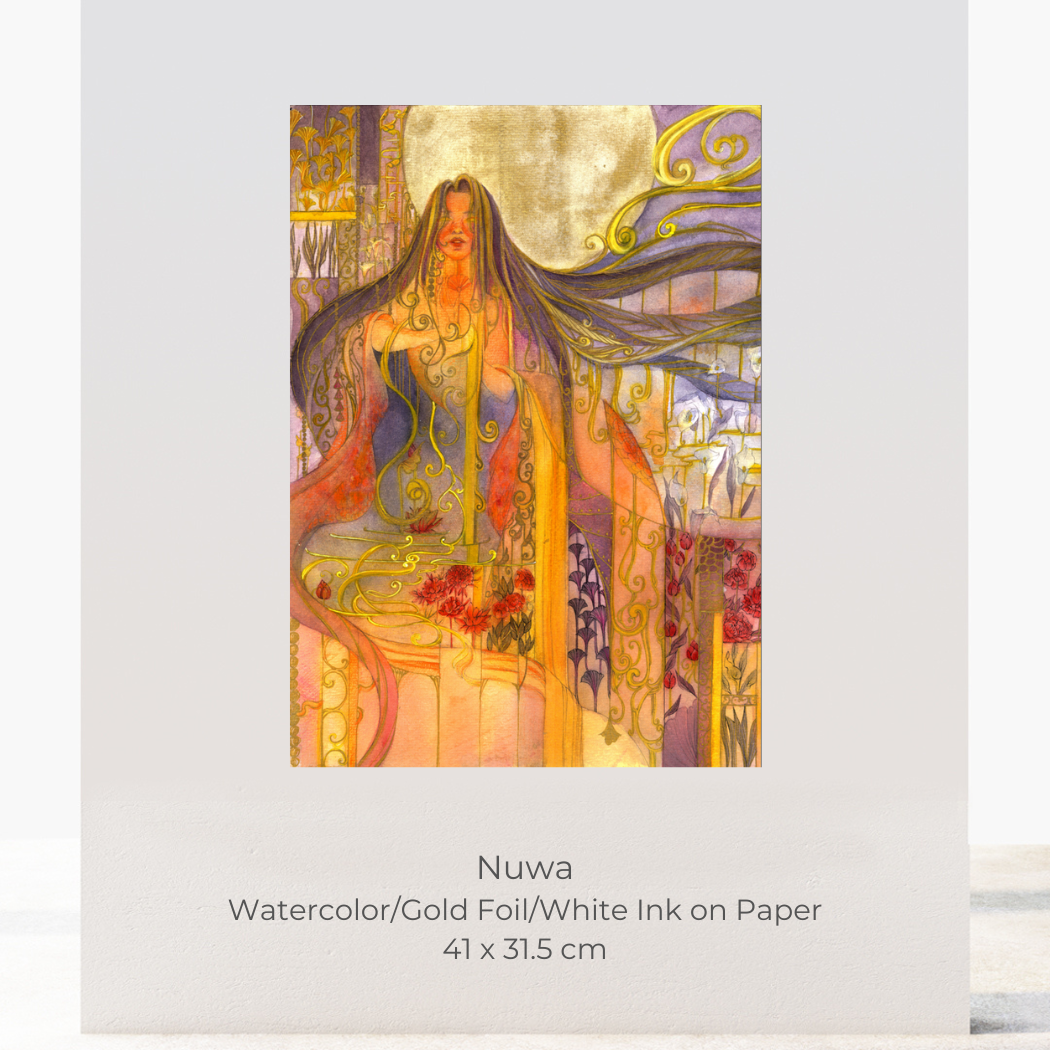 To that end, I work primarily in watercolor—a medium that is decidedly capricious with a mind of its own. Drawing inspiration from a variety of sources, ranging from Klimt and Mucha to Tran Nguyen, I sought to depict these female figures in mythology in their full glory, juxtaposing sharply precise linework alongside blooms and washes of watercolor paint while incorporating gold ink and foil to bring their full strength and power to life."